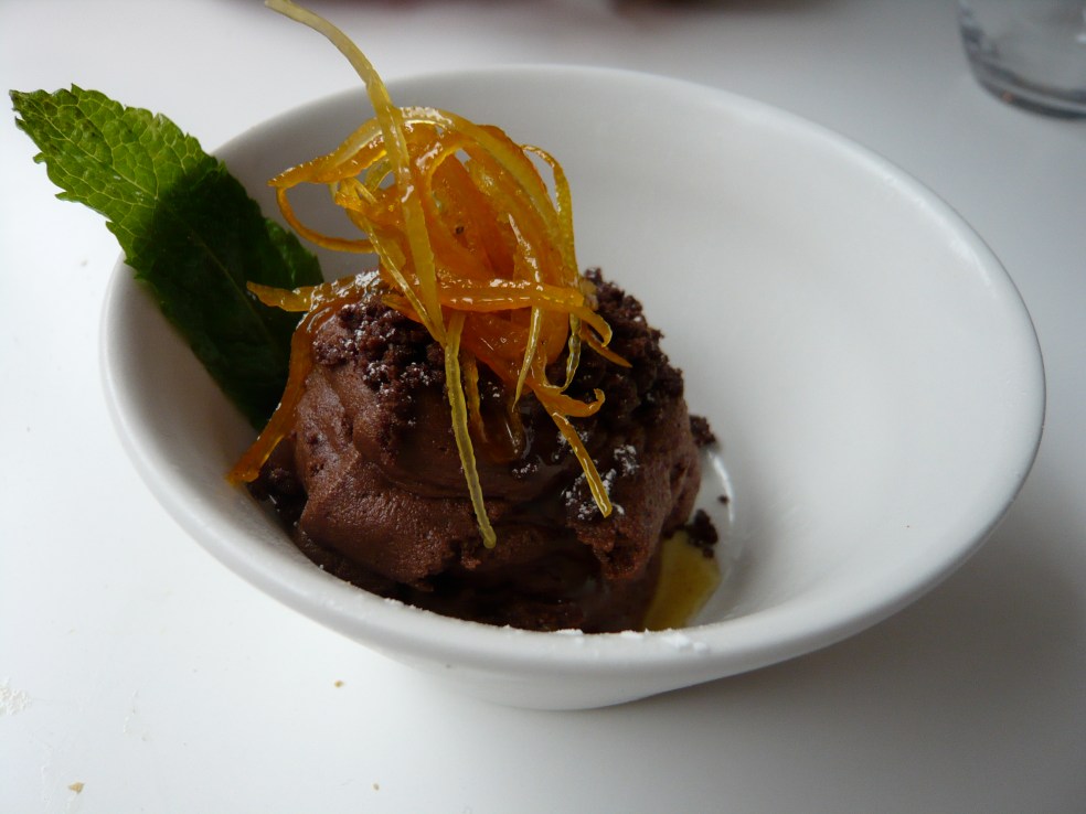 To finish a chocolate mousse with orange zest – I’m not sure I’d call it a mousse it was too dense for that. But it was delicious, thinly paired candied zest, chocolate orange crumb and with a lick of the delicious olive oil was a great riff on the classic chocolate orange pairing.