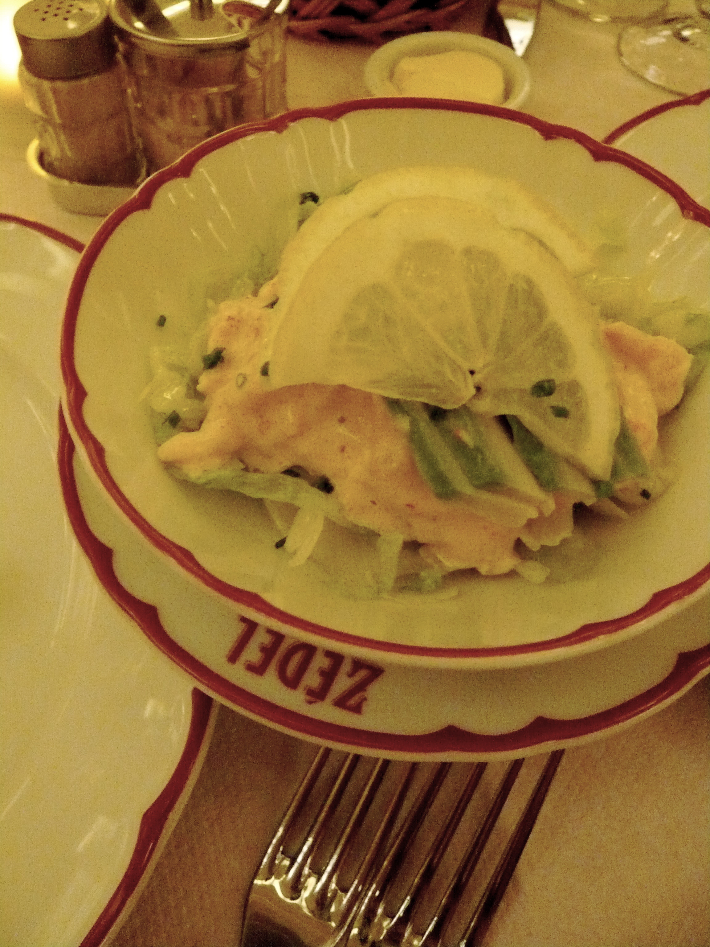 The brasserie, an ornate 220 cover room, is a recession busting grand liner. Descend the steps and down here, all is impervious to the current economic woes of Europe. The interior alone is worth a visit. According to Architecture Today Magazine, the interiors of Brasserie Zédel are “probably the best and most authentic series of 1930s interiors in this country”. The marble clad room presided over by its grand clock, is frankly one of the most impressive in the capital. The original interiors were taken apart when the building was rebuilt and then replaced piece by piece, before the finishing touches of designer David Collins were lavished upon them. Not that you’d know. You could easily imagine this place as always having been here. Moreover, I’d say that few restaurants are able to instantly transport you elsewhere in place and time. In addition to the grand dining room there is an art deco Bar Américain – a classic cocktail bar with a small snack menu and a live Cabaret and Jazz venue ‘The Crazy Coqs’. Completing the journey back to Paris’s golden age is the Zinc Café – a street-level café and wine bar.